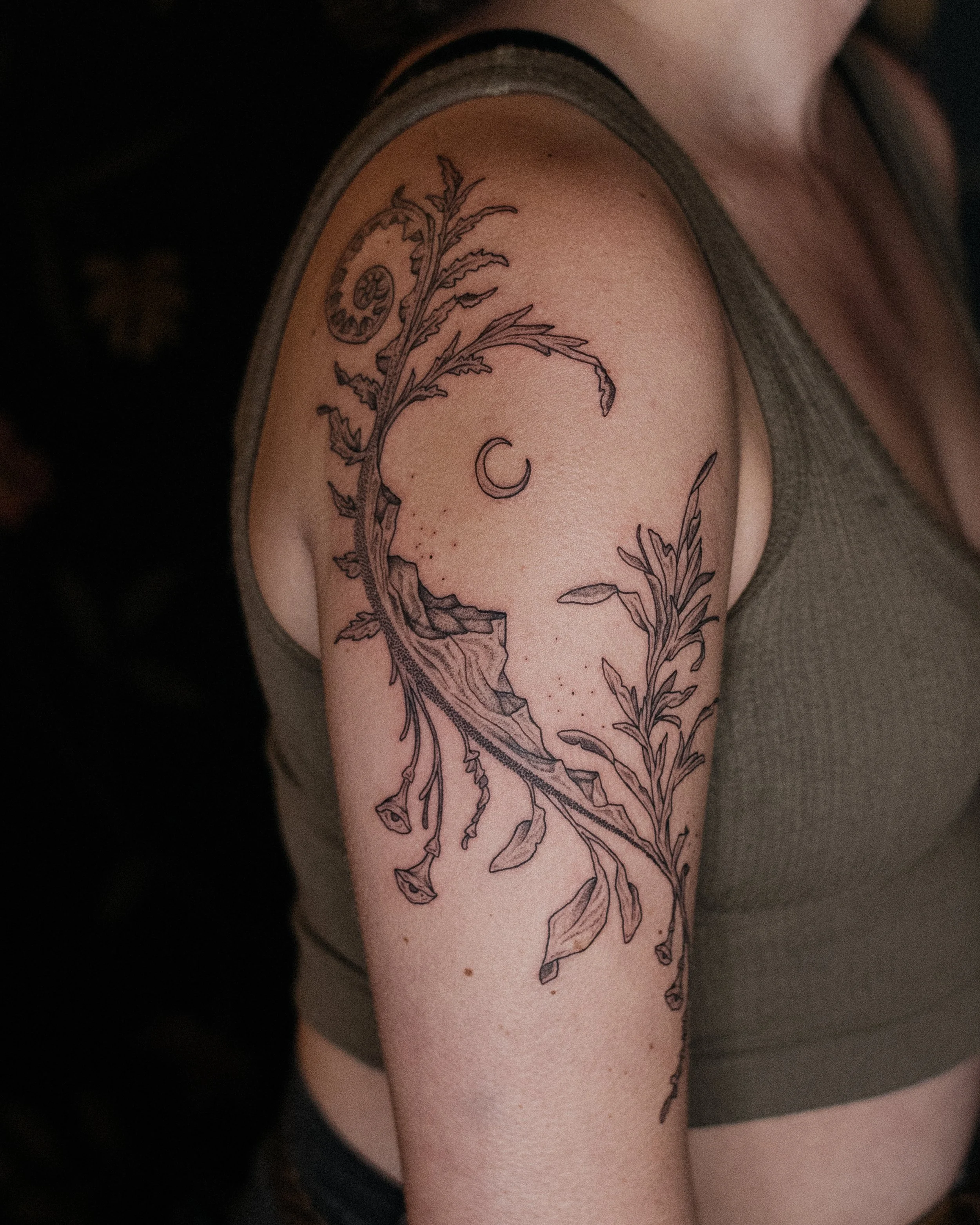Hello dear one, my name is Mary (she/they), and I am a queer, connection-and-care-oriented multi-media artist and witch. Particularly, I am a spiritual companion, 500 hour certified yoga teacher, creative portrait photographer, devoted friend, and aspiring ceremonialist, specializing in full day freehand machine and handpoke tattoo sessions. I create tattoos as living poems, declaring the body as the earth, and the earth as God - visioning wildflowers, candles, evergreen sprigs, spirit faces, trancestor witches, and surrealist mountain-scapes that dance across the body. My process is rooted in collaborative conversation, play, curiosity, experimentation, and an intuitive instinct towards freaky beauty. I believe in tattooing as an art of folk craft and village care - I imagine these tattoos as visual prayers, icons of innate interconnectedness, that can act as pathways back to remembering, and living into, the wiggly, weird, pulsating Real (magic? god? love? is that you?) who is within all matter and magic and moments.