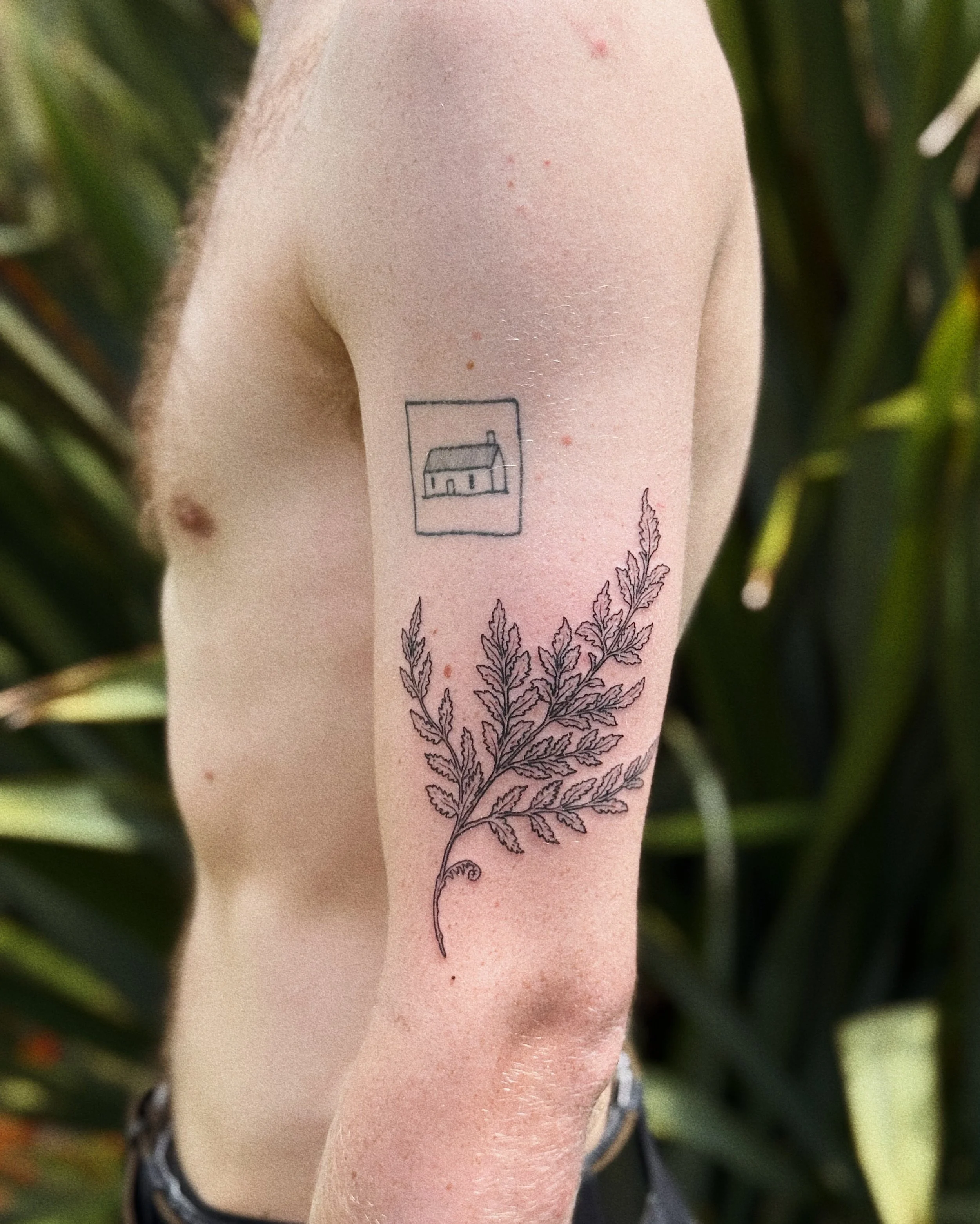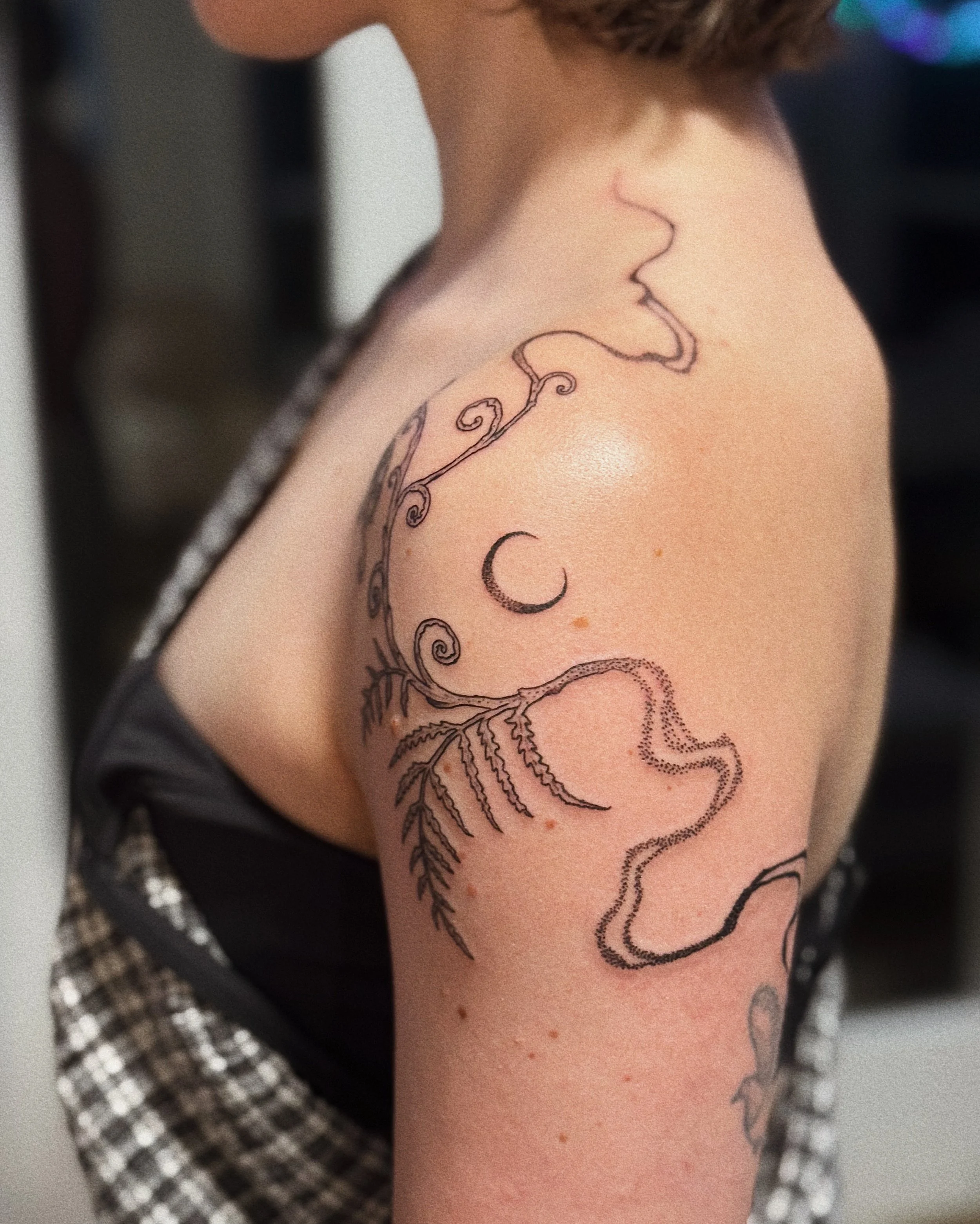 Fern flow for Julia, coming out of a handpoked kererū done by her partner hehe