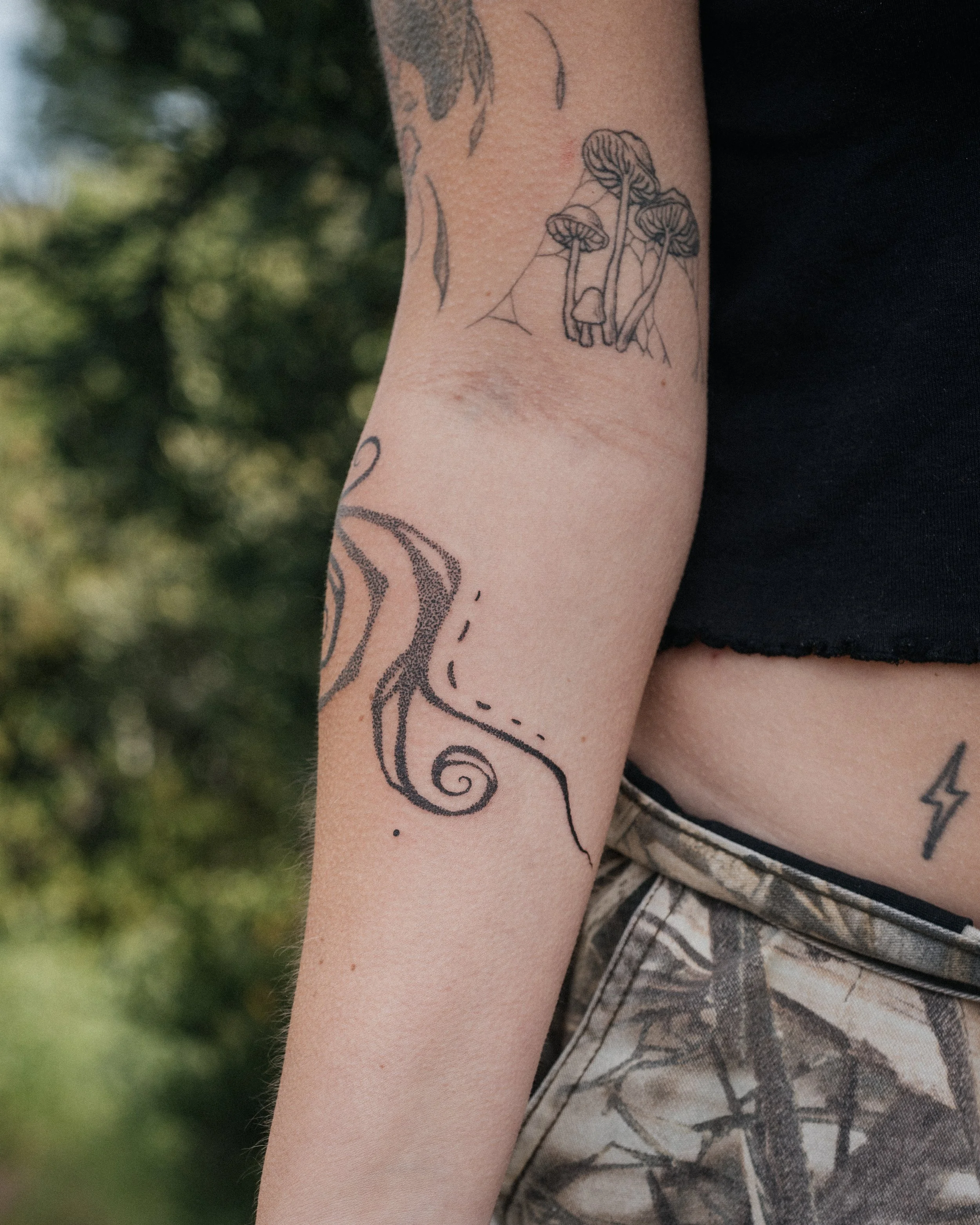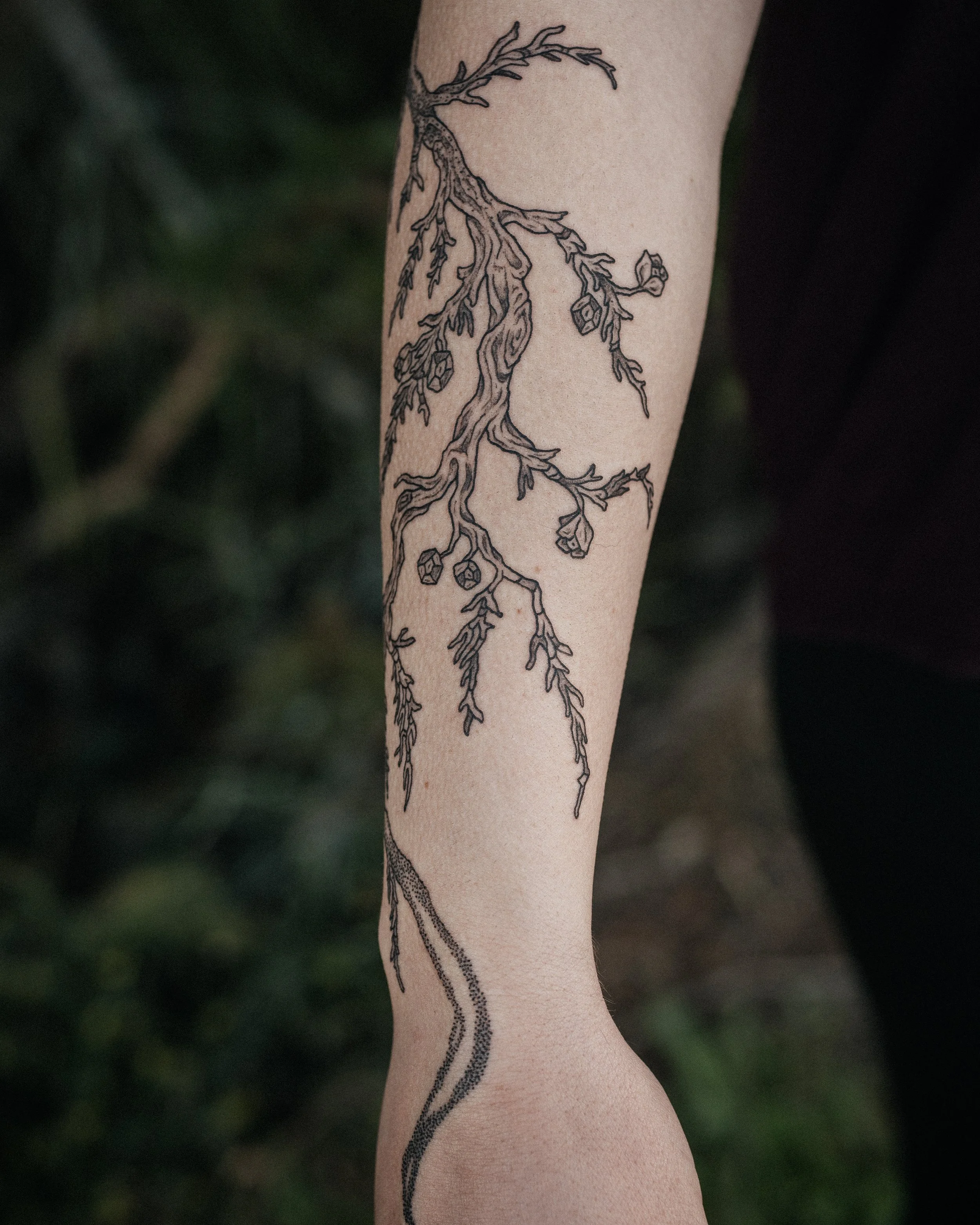 In the midst of leaving social media as my primary stream of sharing creative work and my inner world, 2025 has contained so much sweetness and challenge in my tattooing. It’s been a relief to not feel as though every time after I make a piece, I need to edit and share as soon as possible, with fear of backlog or falling behind on expectation of content. Every person who has said yes to this craft with me this year has felt so clearly distinct, every project very particular to the person I am making with - I have had more time, more space, to tend to myself, my community, and my values, which in turn has led to a feeling of being allowed, as though I don’t need to appease a completely contrived expectation of “creative professionalism” or an online persona translated into the flesh - to be seen just as a little dude making art, in my distractibility and inability to be polished. I hope this inner permission might continue to bloom. So: here’s some ink on bodies, made from conversation and connection; to earth, to heart, to god, to each other. All pieces freehand drawn on unless otherwise specified.